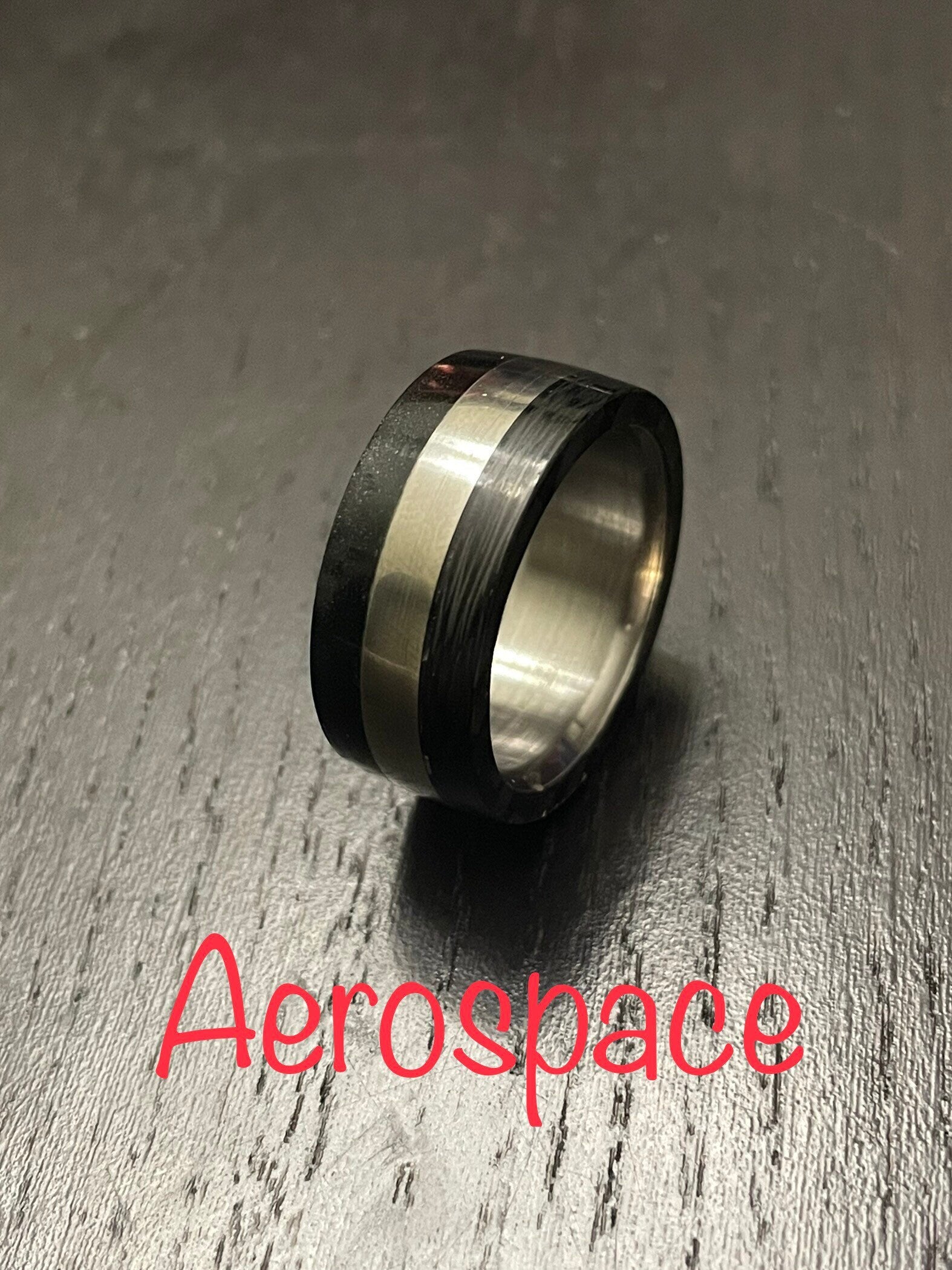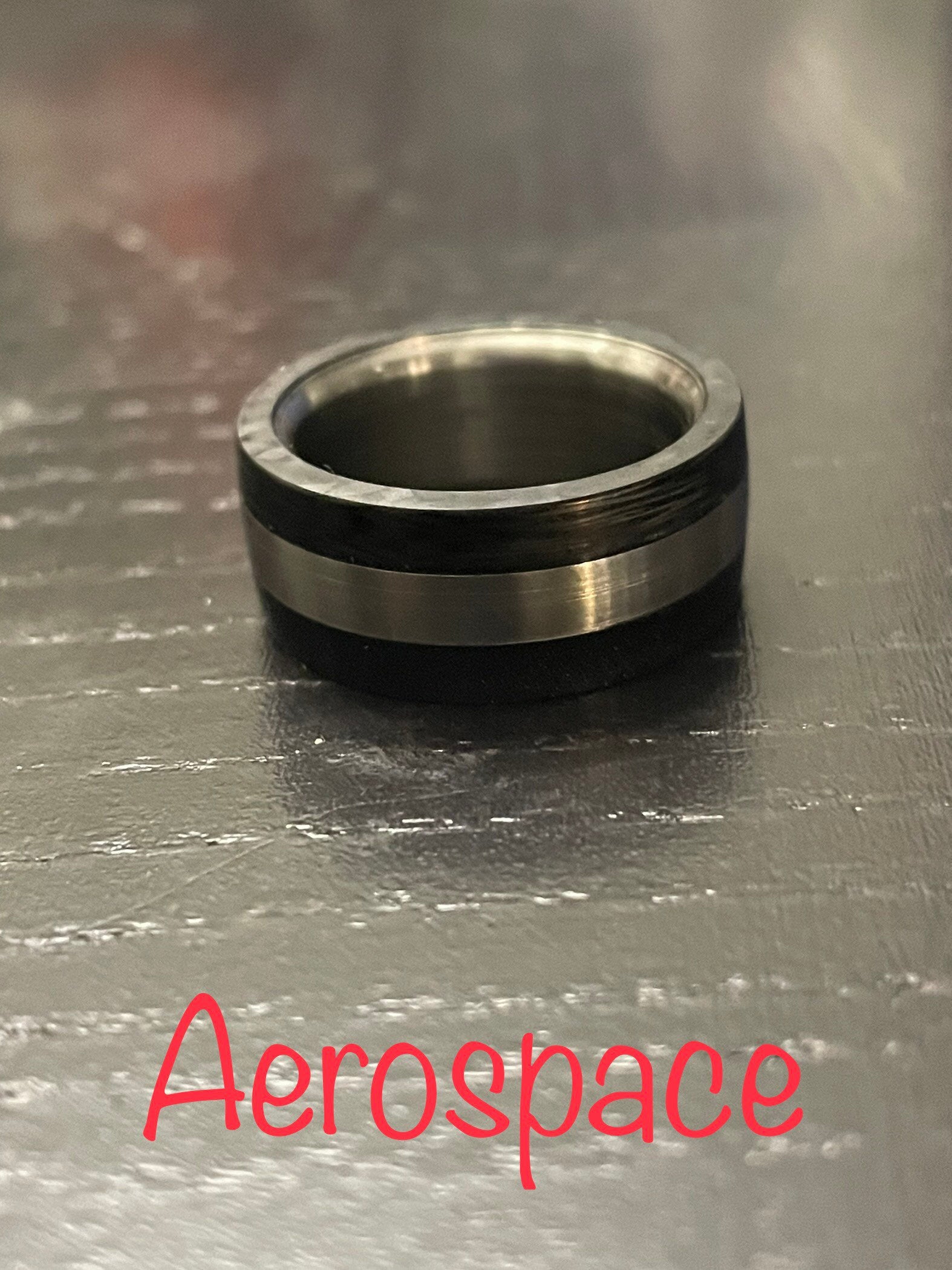 The Aerospace ring is a 3 piece ring consisting of Aerospace materials, Carbon Fiber and Grade 5 Titanium. Great gift for anybody in the aviation/aerospace industry, Pilot in the family, or anybody in general.