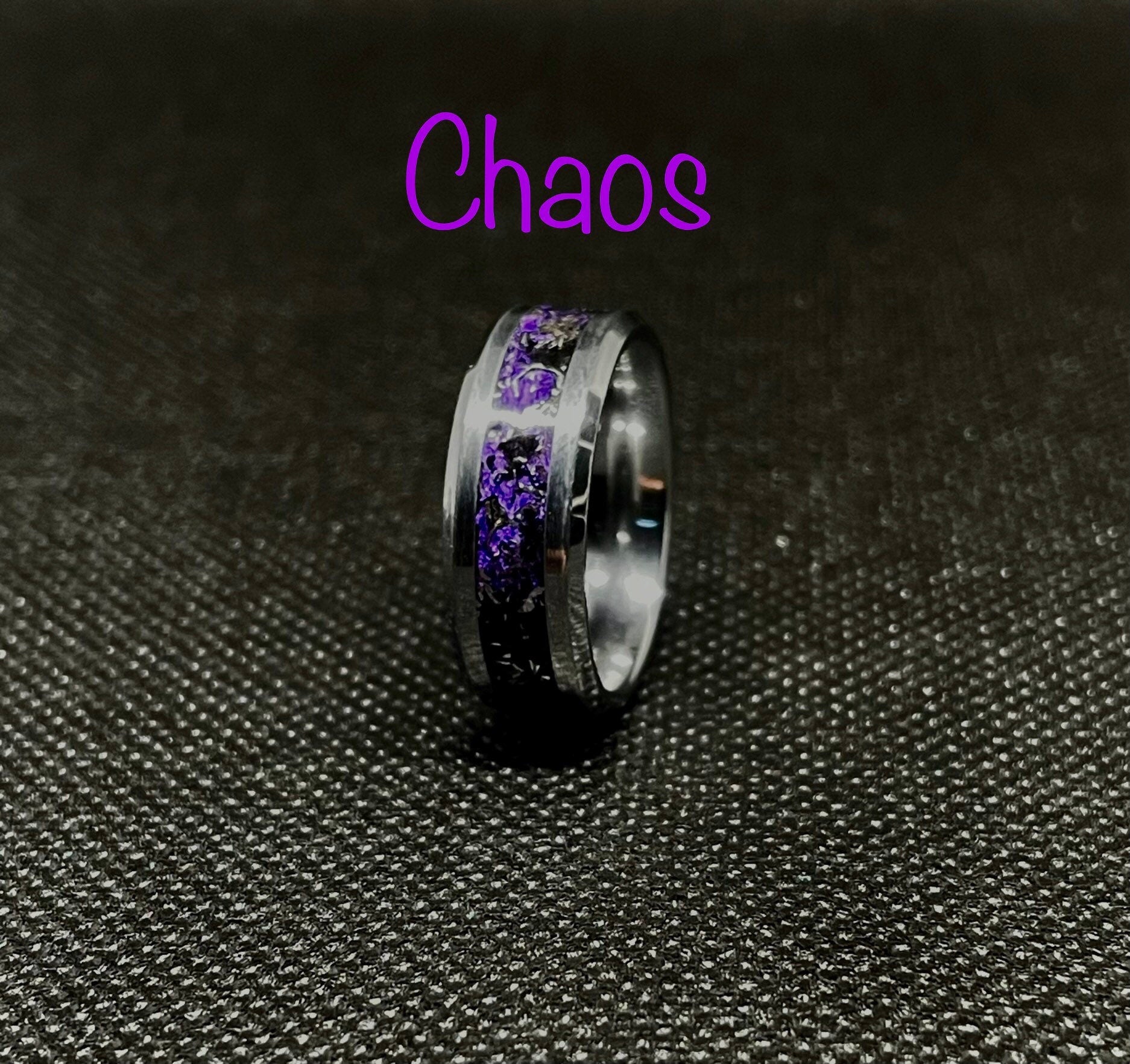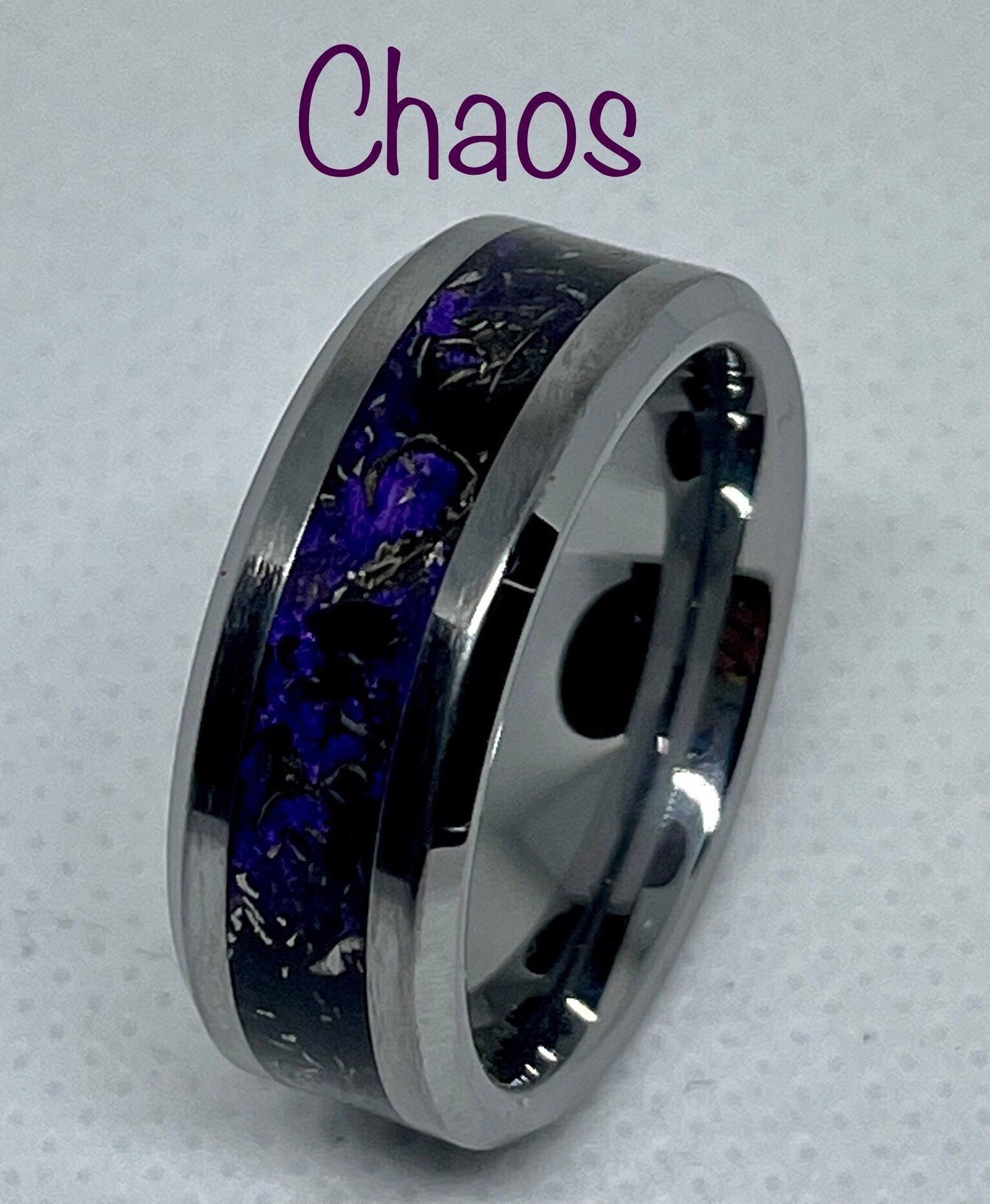 This simple design is a Tungsten band containing Munionalusta meteorite shavings over a carbon black base and random splashes of reflex violet pigment.