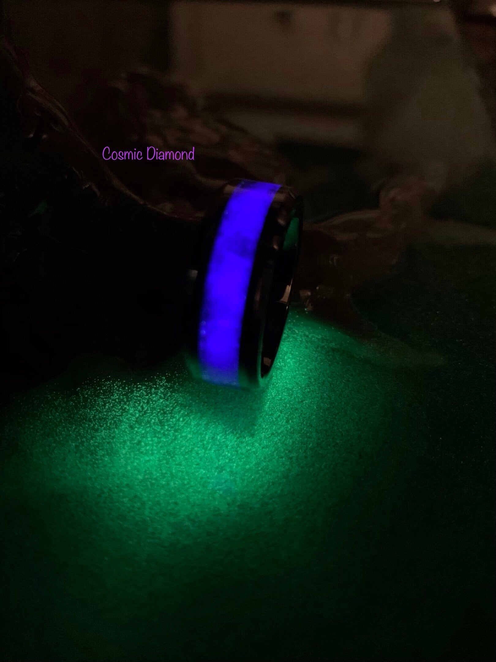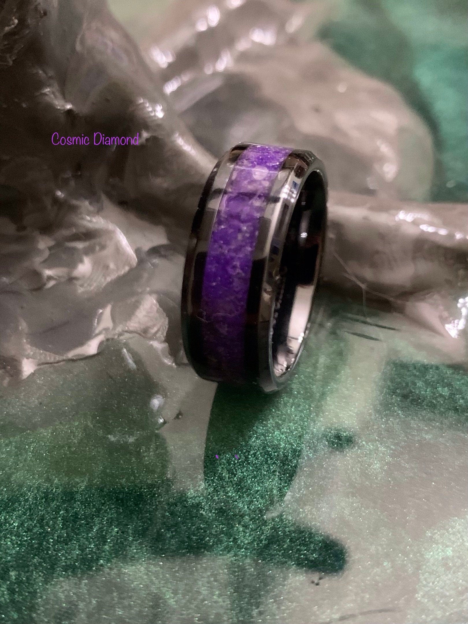 Black Ceramic band containing a beautiful violet pigment from the witch head nebula with purple glow powder, Amethyst, and Diamond Dust.