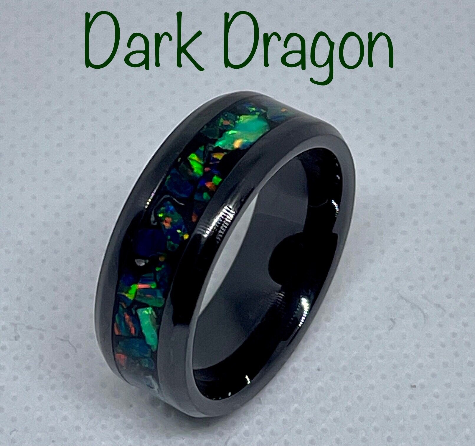 A simple but beautiful arrangement of dragon scale opal with hints of neon green opal over a black base in a black ceramic band.