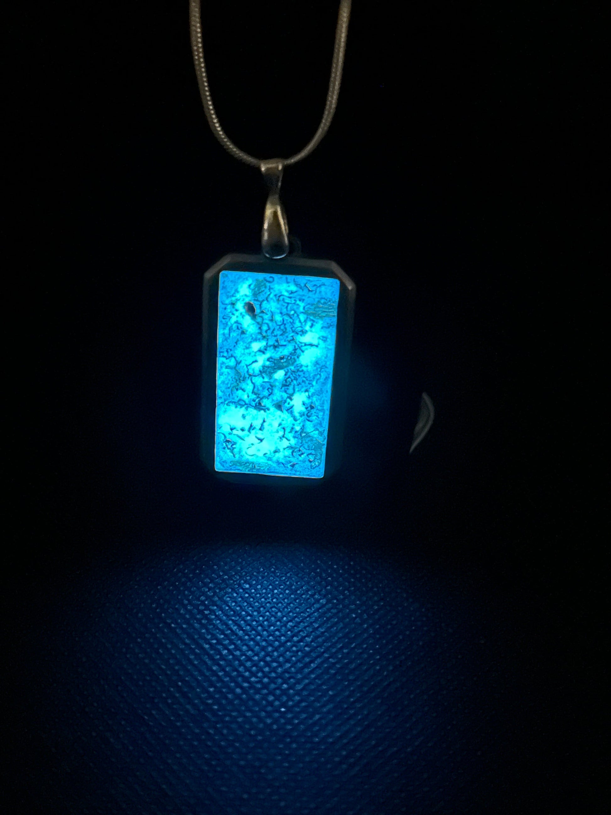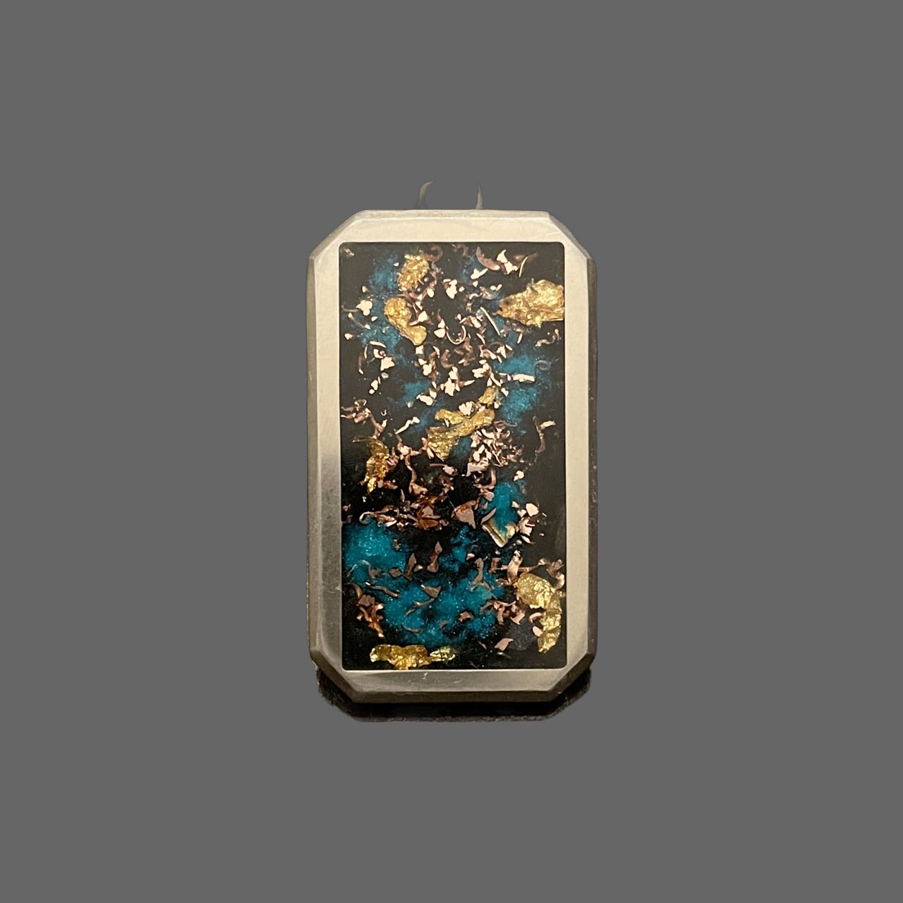 Lost treasure in the deep. Our discovery ring is also available in a Titanium Pendant. Copper shavings and gold leaf over a black base with a special pigment mix to create an oxidized look. Charge with UV light for a blue glow.