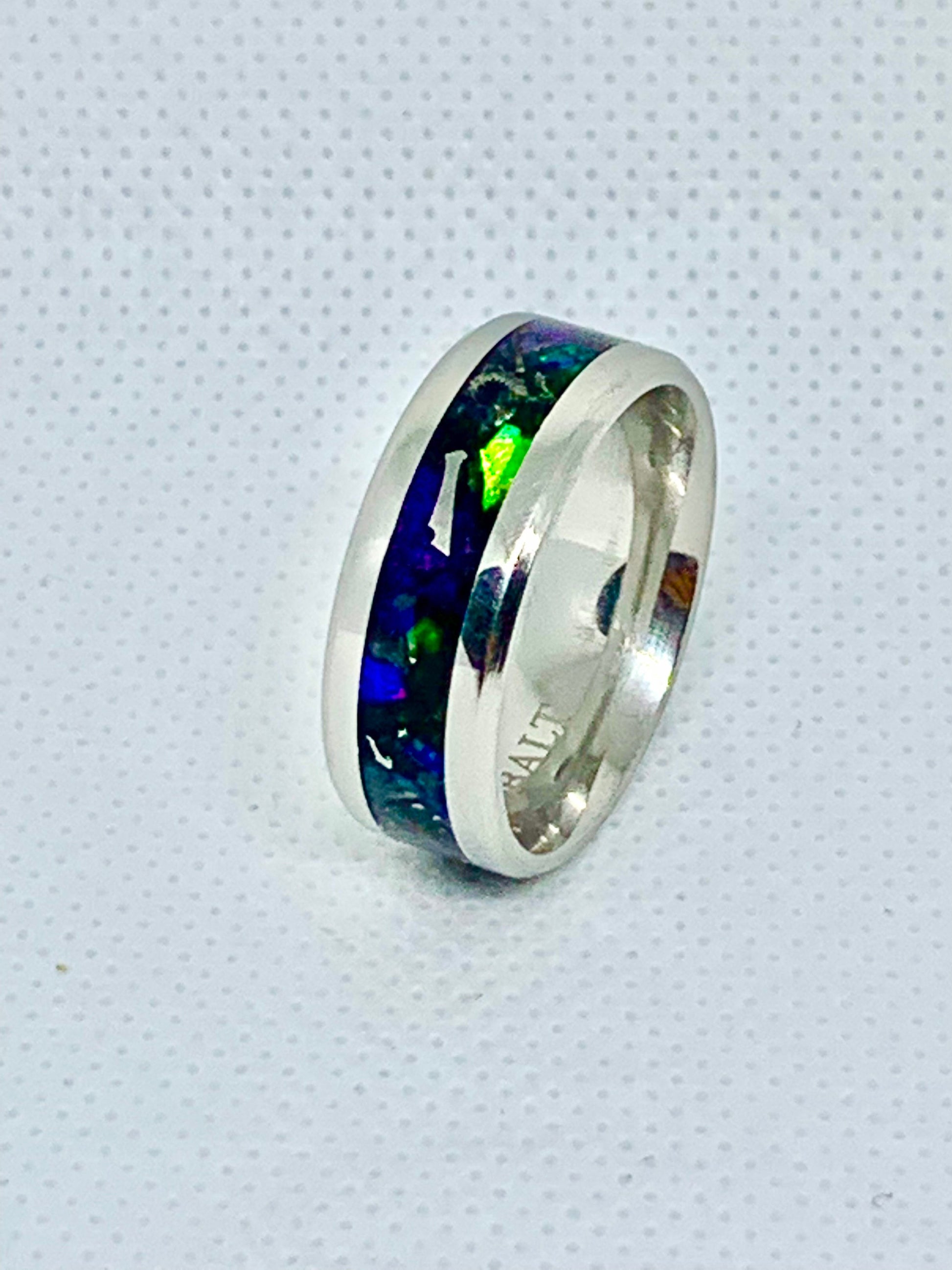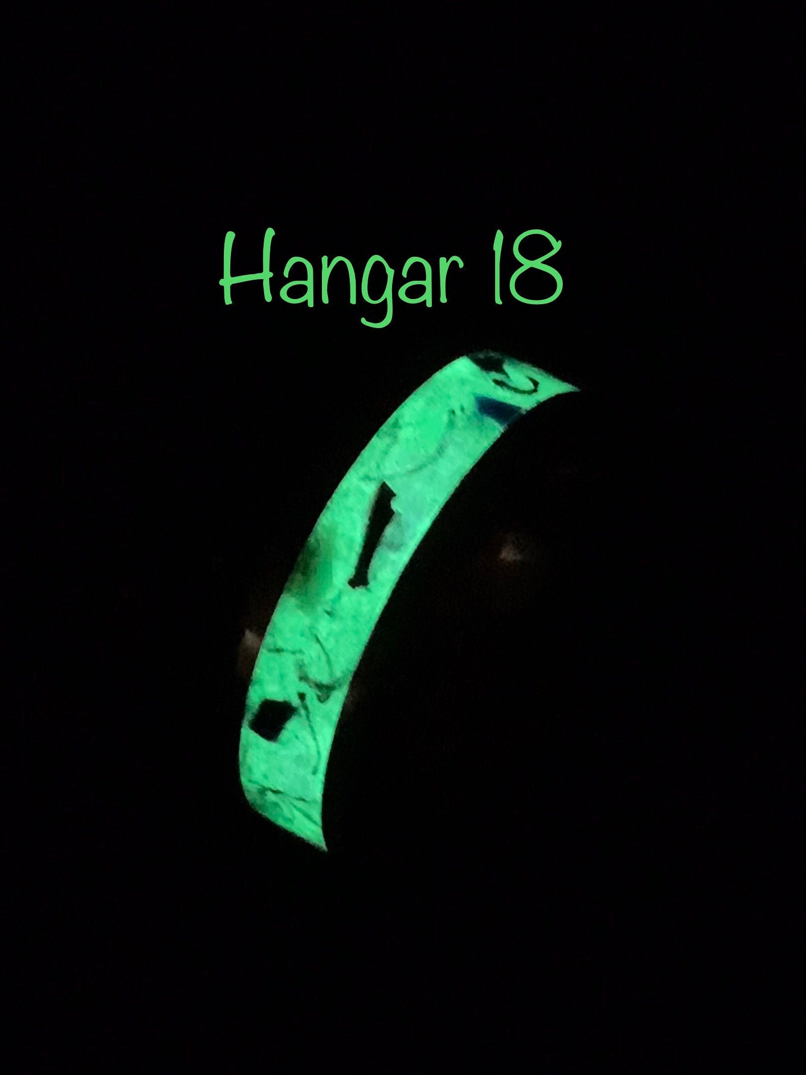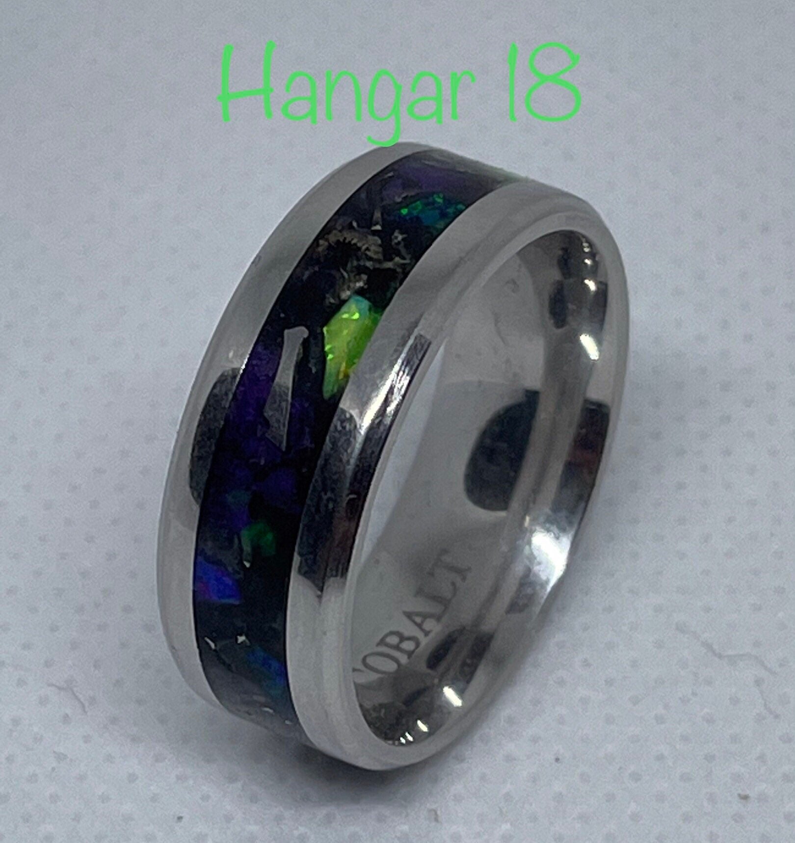 Our first ring offered in cobalt chromium. What’s in Hangar 18? Foreign materials not of this world. Meteorite chunk and shavings surrounded by neon green opal, deep space opal, black emerald opal, violet, and neon green pigment. When charged by uv or sunlight the Hangar glows bright green revealing eerie silhouettes of its contents.