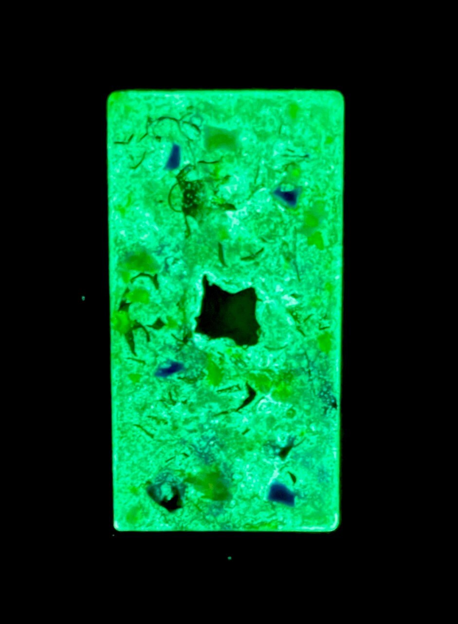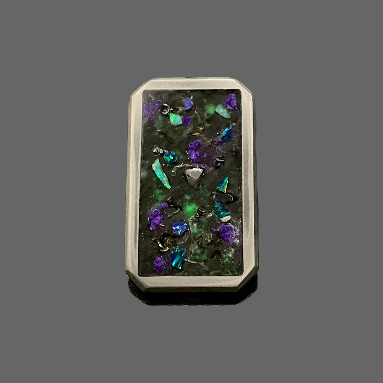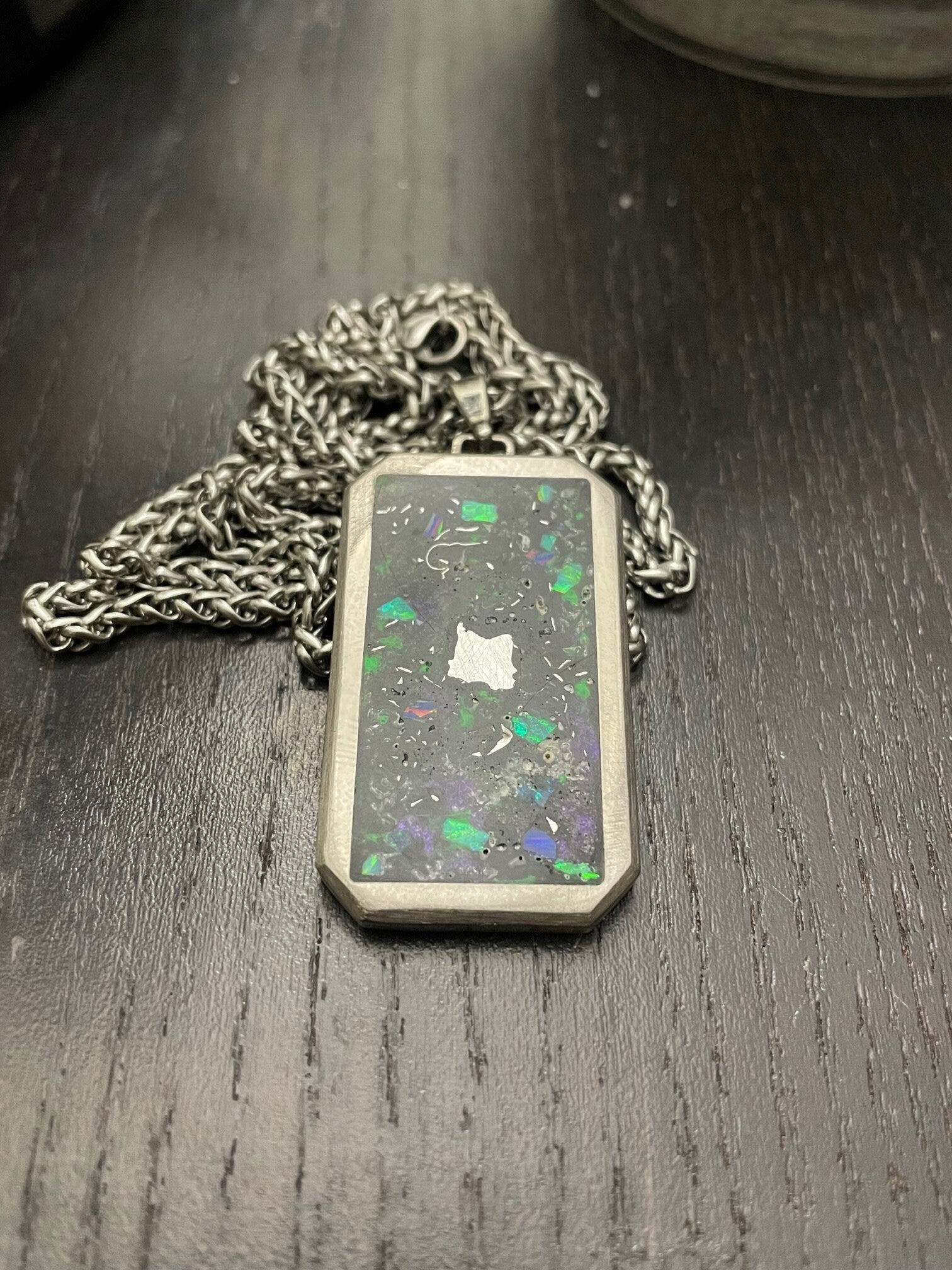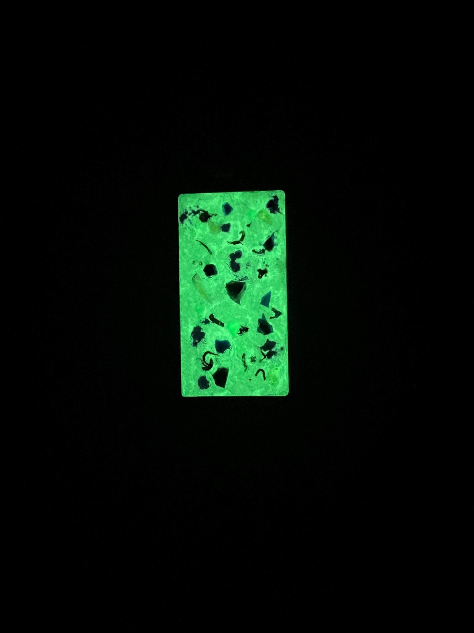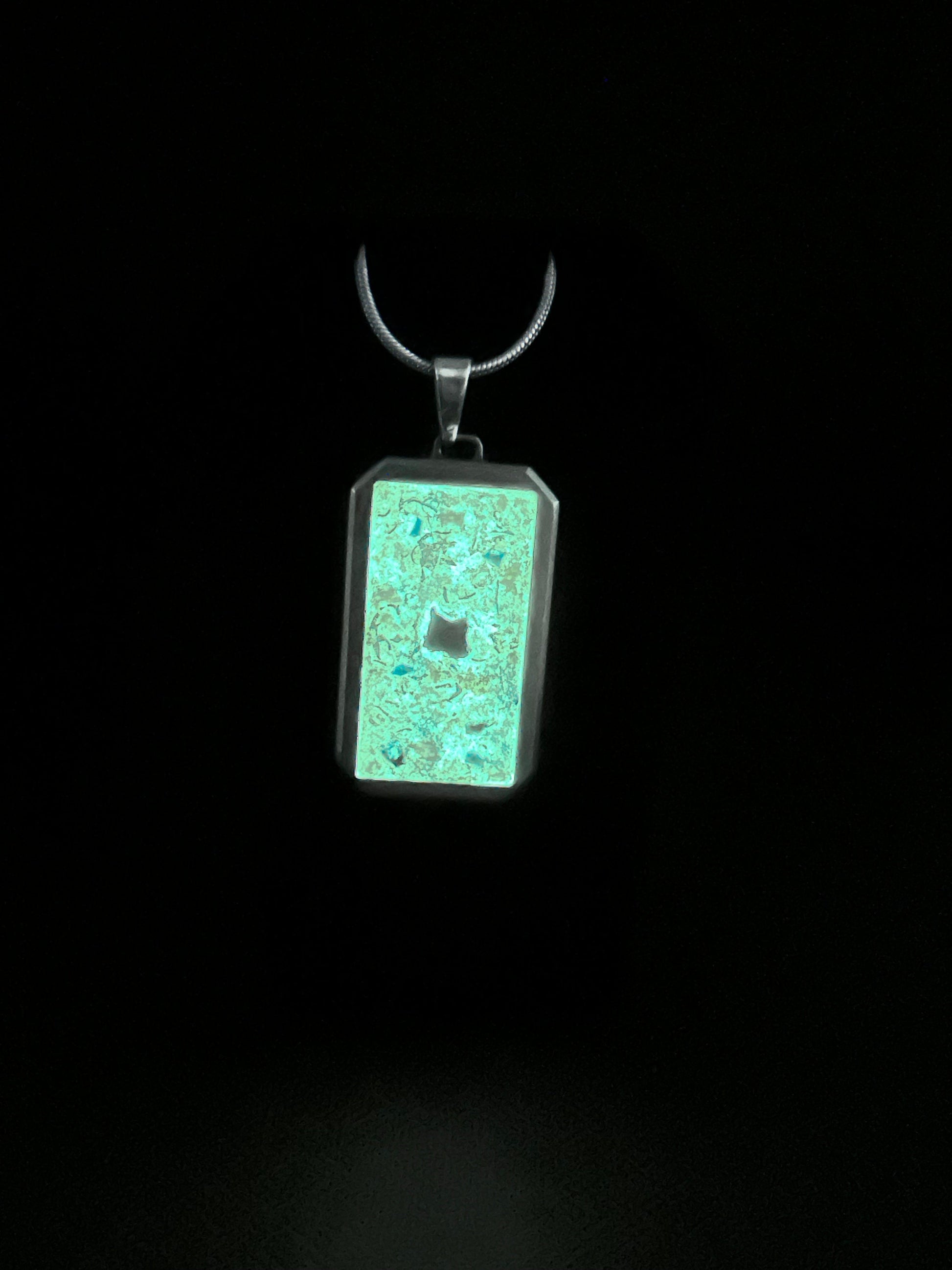 Our Hangar 18 ring is also a pendant. What’s in Hangar 18? Foreign materials not of this world. Meteorite chunk and shavings surrounded by neon green opal, deep space opal, black emerald opal, violet, and neon green pigment. When charged by uv or sunlight the Hangar glows bright green revealing eerie silhouettes of its contents.