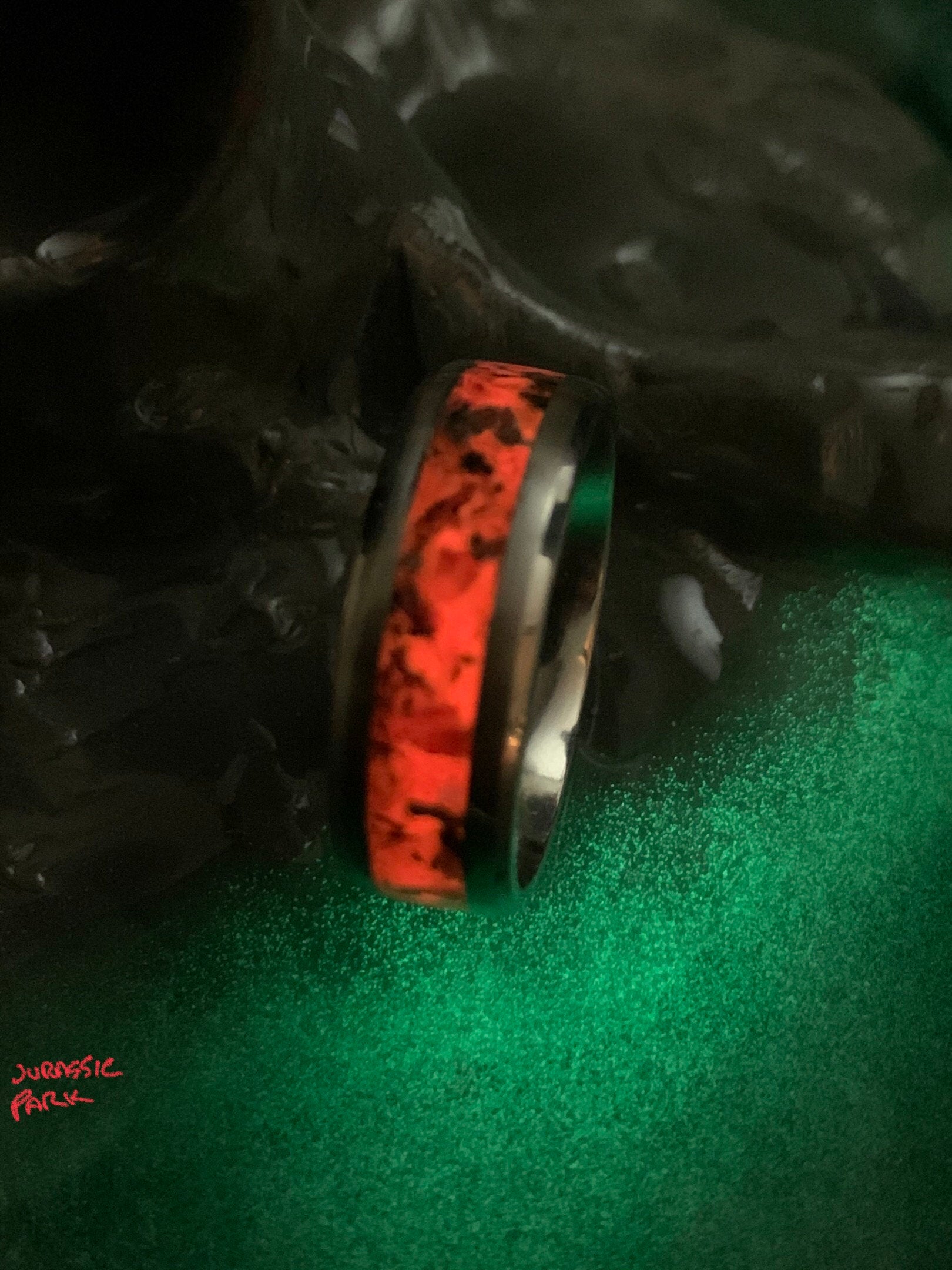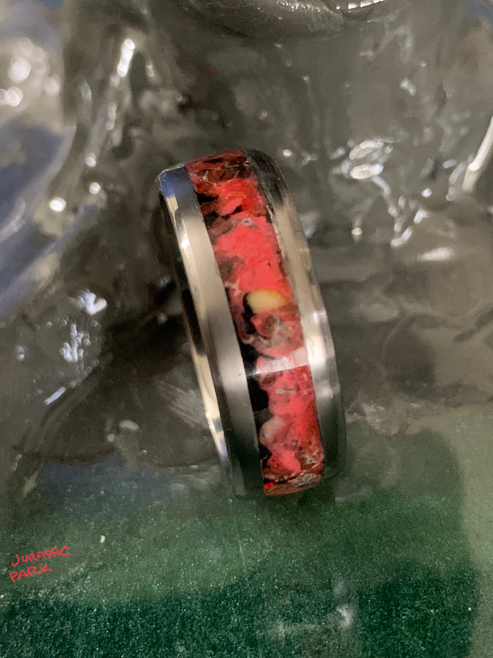 Inspired by Jurassic Park. Titanium band with a black and red pigment that produces a lava like glow. Crushed amber and dinosaur bone fragments inlay pay tribute to the creation process (Think Mr. DNA) of the ancient beasts. Choose from just plain old Dinosaur bone fragments or choose from Mosasaur tooth, Spinosaur Tooth, Maiasaur bone fragments.
