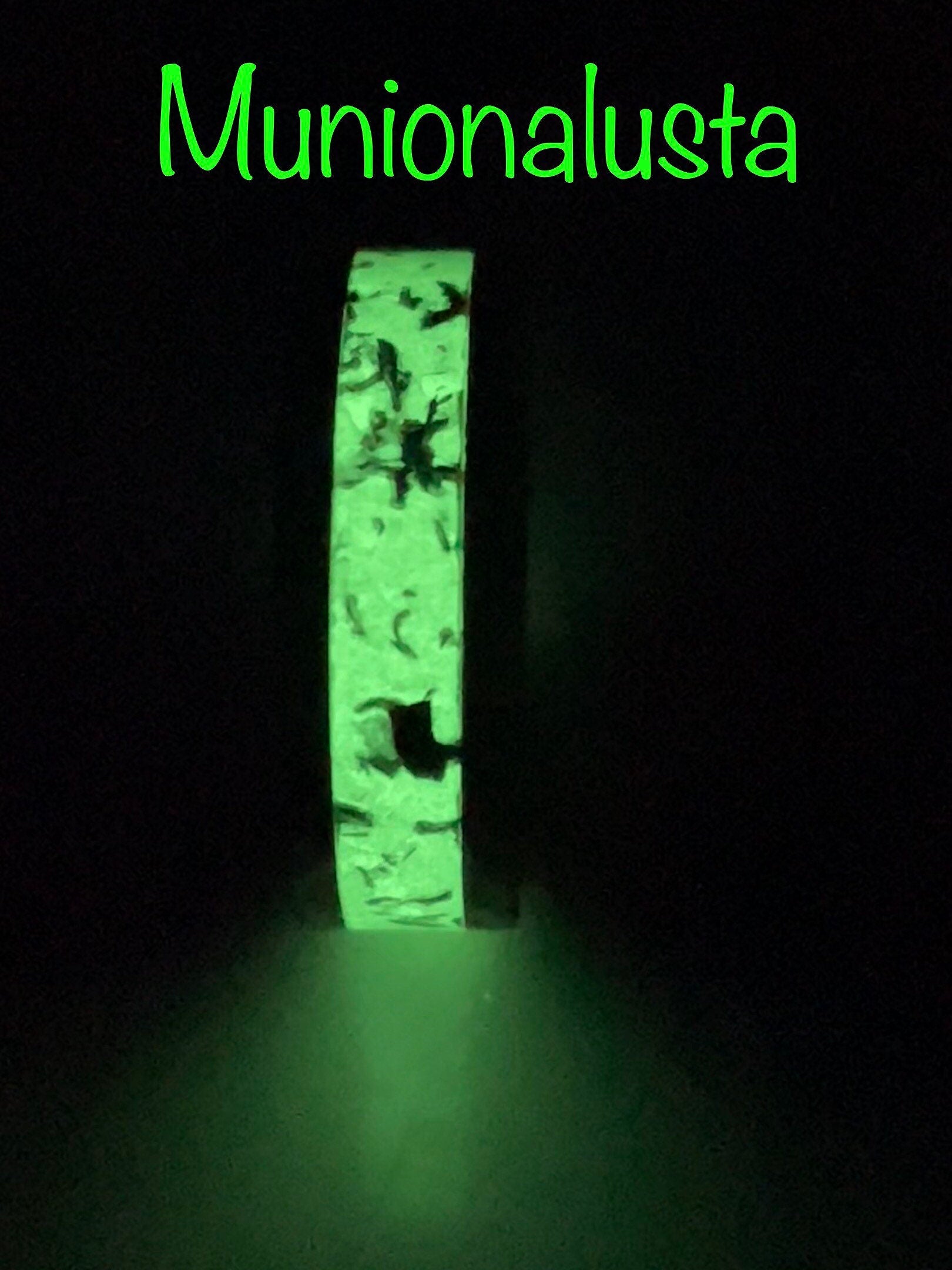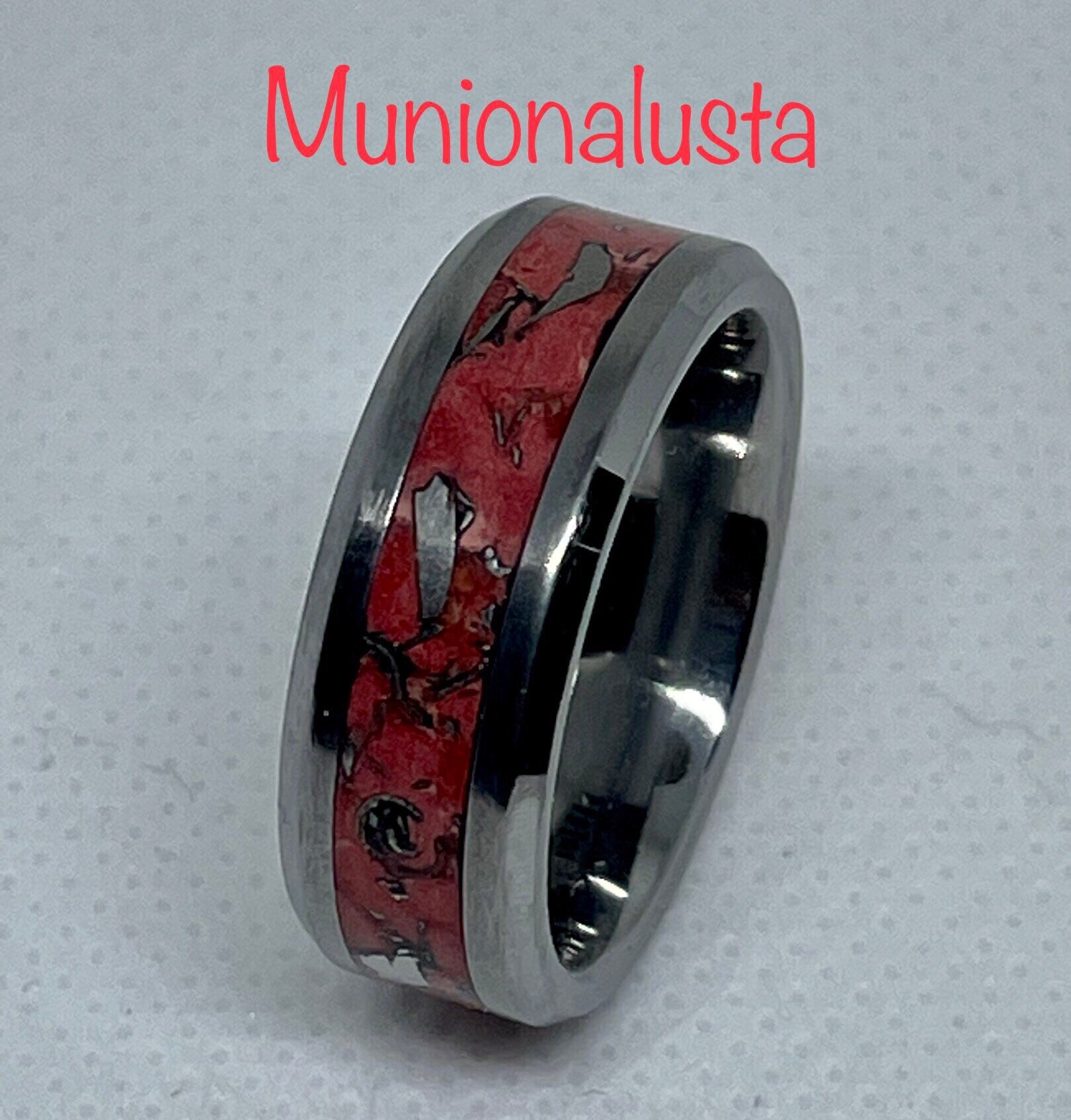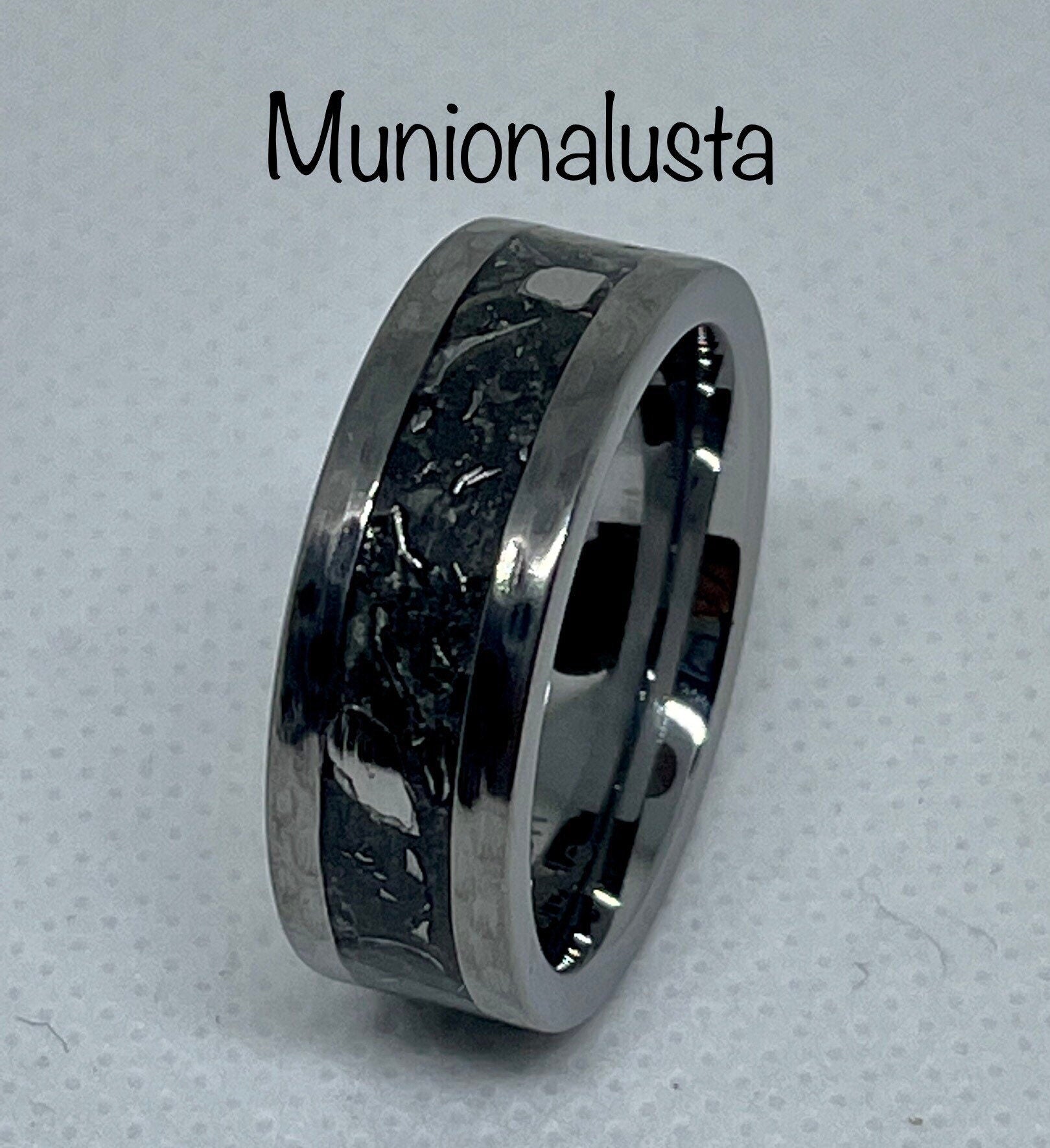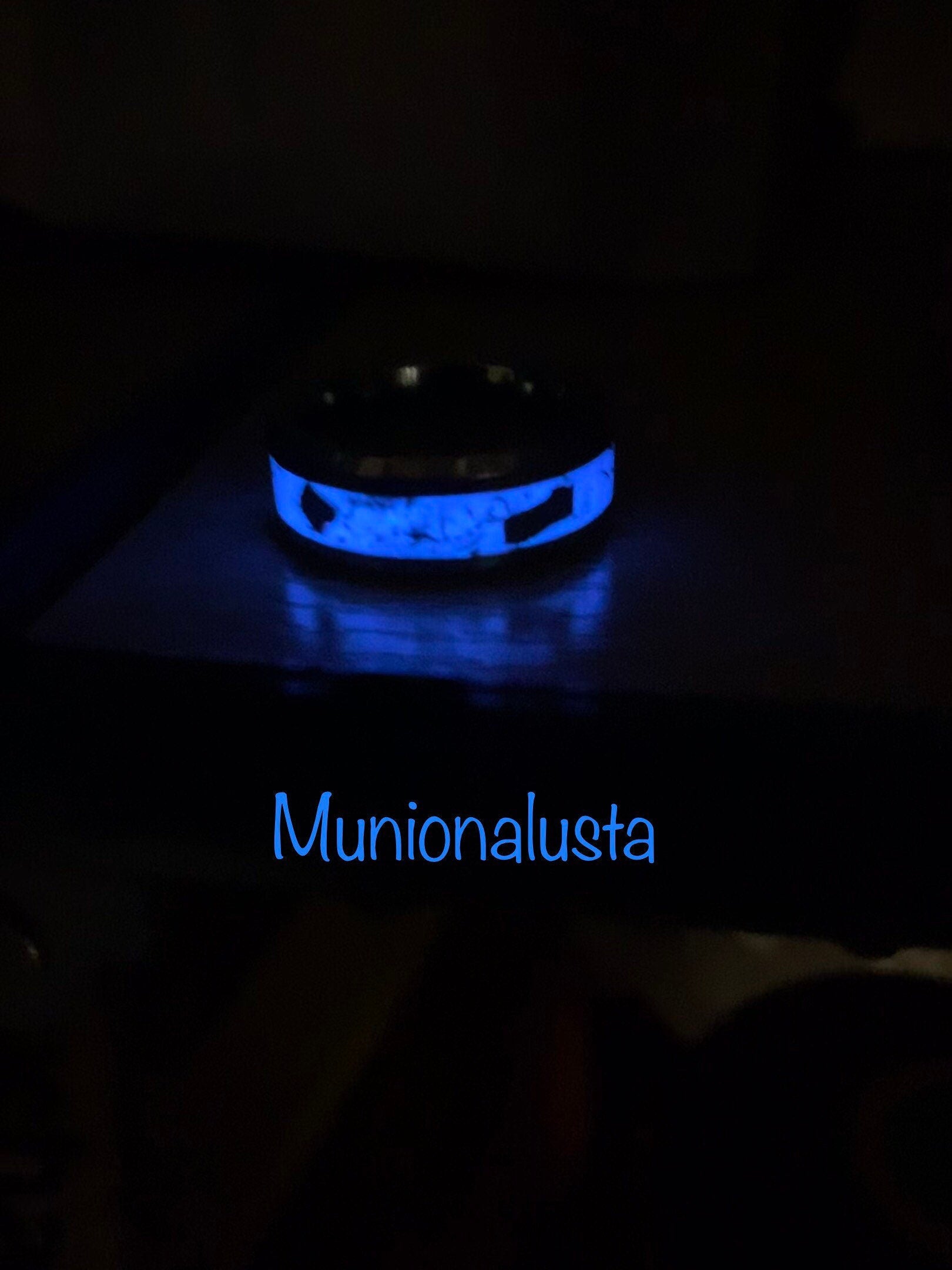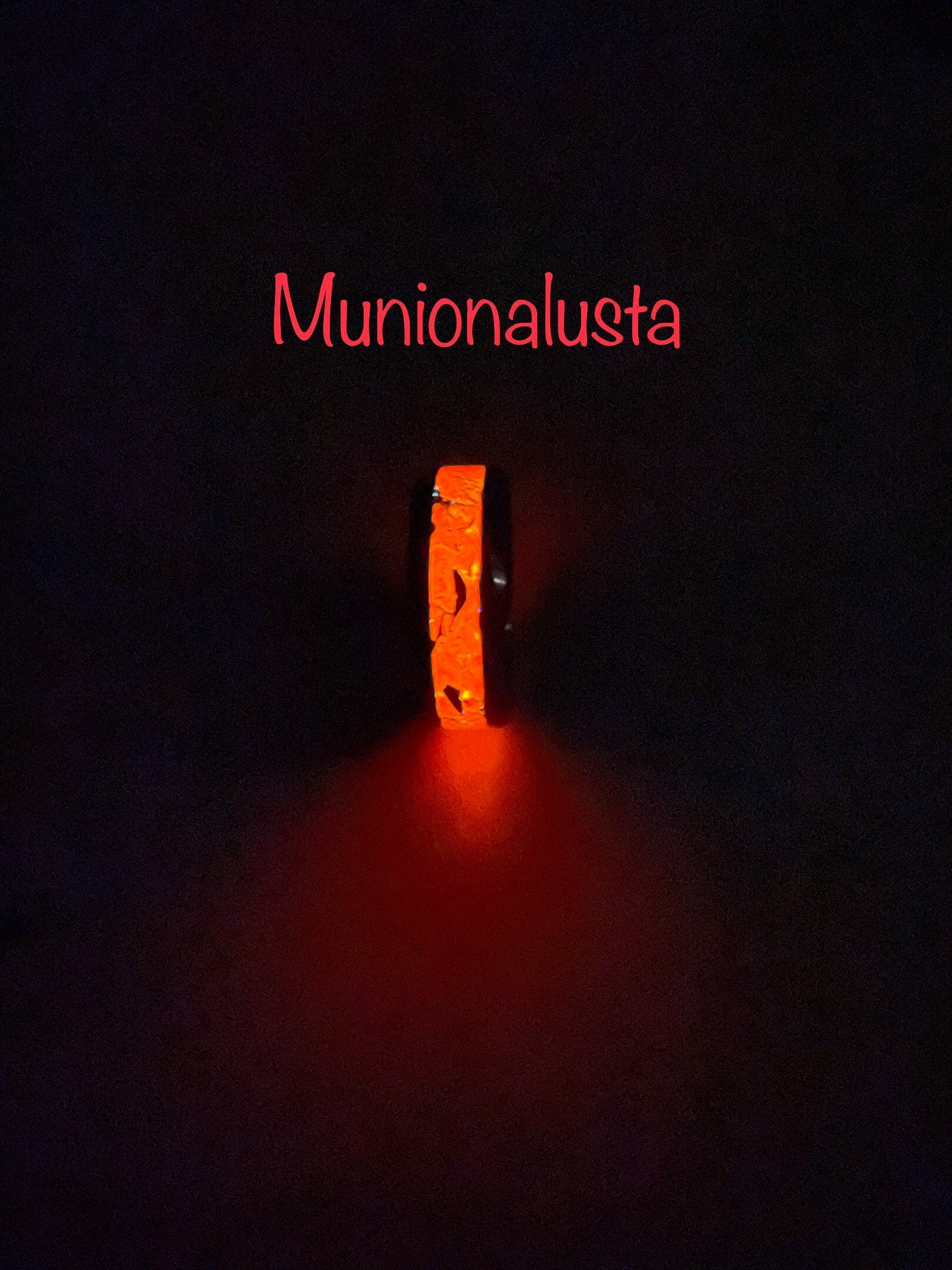 A simple design of Munionalusta meteorite shavings and chunks over a blue sapphire base with blue glow or a red base with a red glow, and black with green glow in a tungsten band. Hammered Tungsten band option also available. Please indicate in a message after your order is placed.