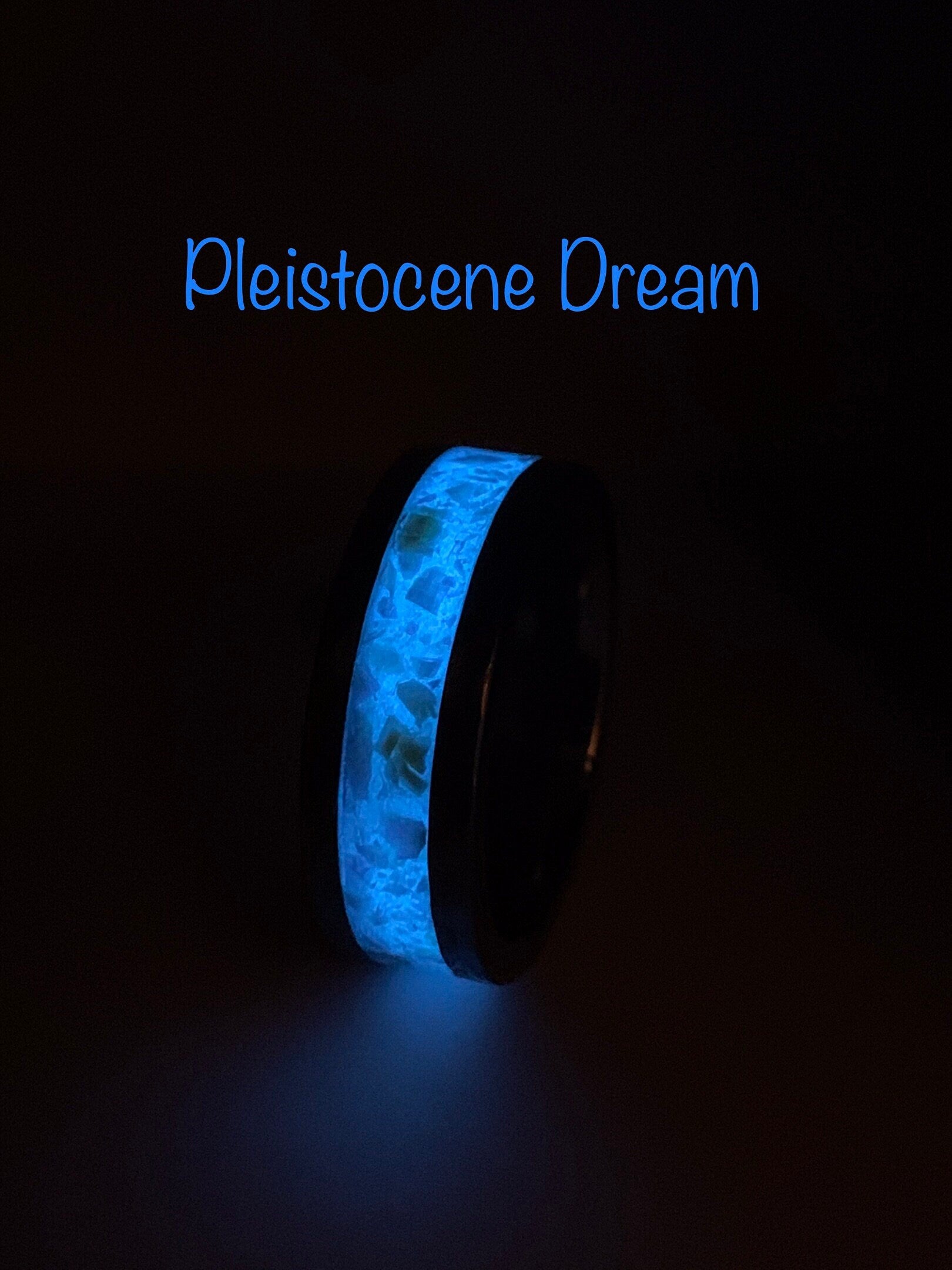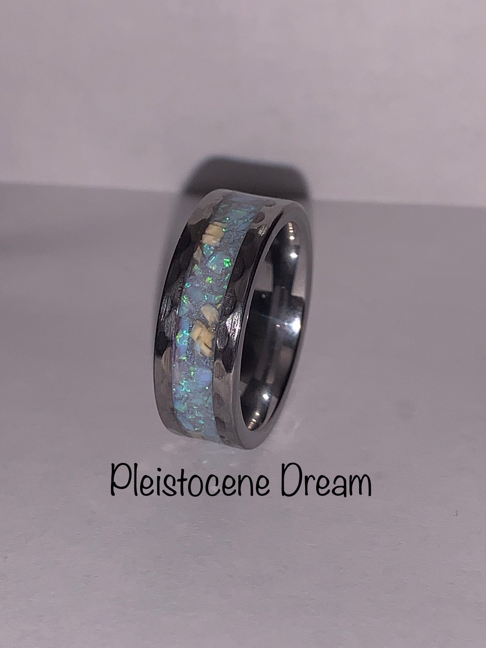 Mammoth tusk surrounded by permafrost opal over a blue glow powder brushed with and iridescent blue pigment. Charge with UV light for a serene blue glow illuminating this prehistoric beast's Hammered Tungsten tomb.