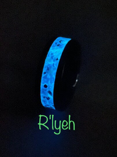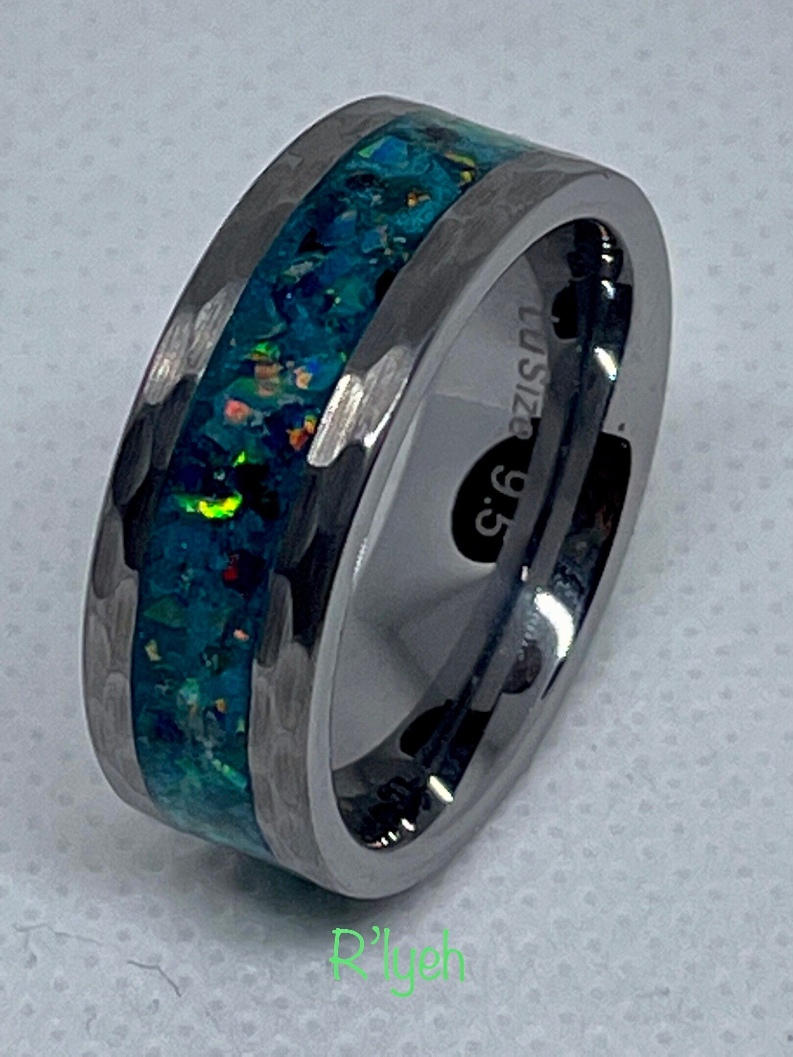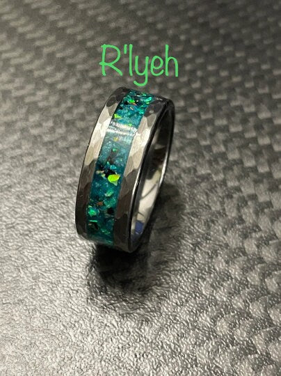The sunken city where Cthulhu slumbers. If this lost city were to have a gift shop, I would like to think this ring would be found there. A mix of crushed dragon scale, cyan, and neon green opal with a special blend of color pigments with blue glow. These special mixtures give a dreary interpretation of décor of the Elder Gods home.