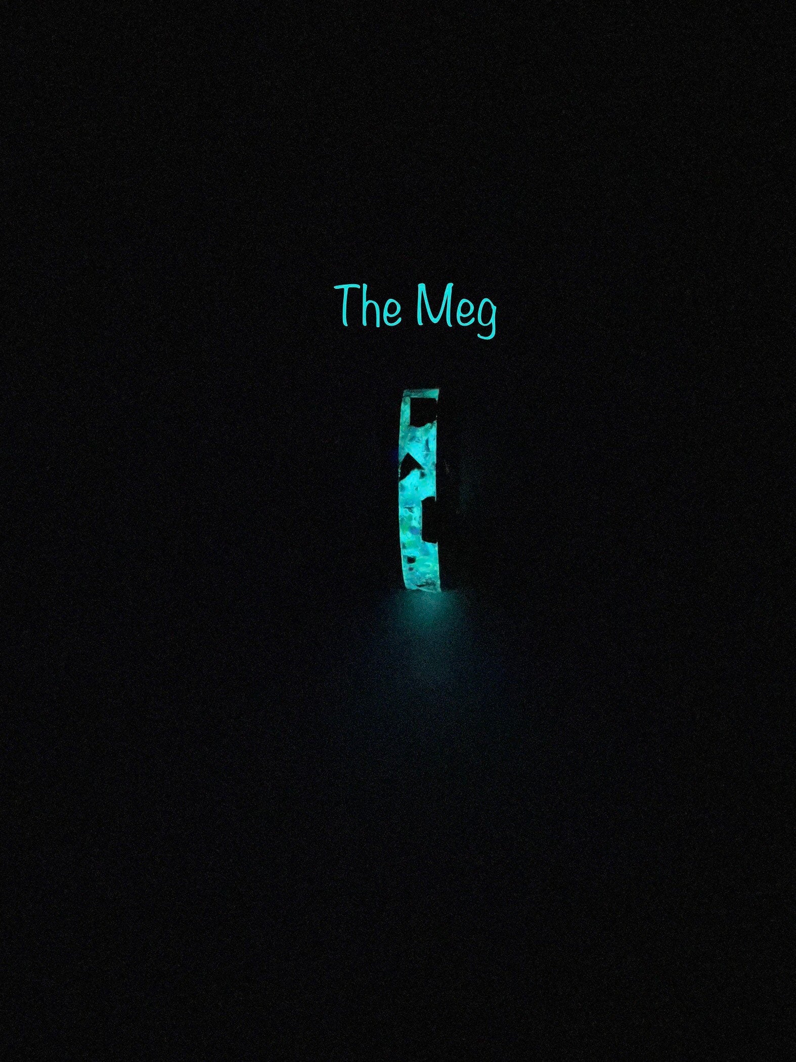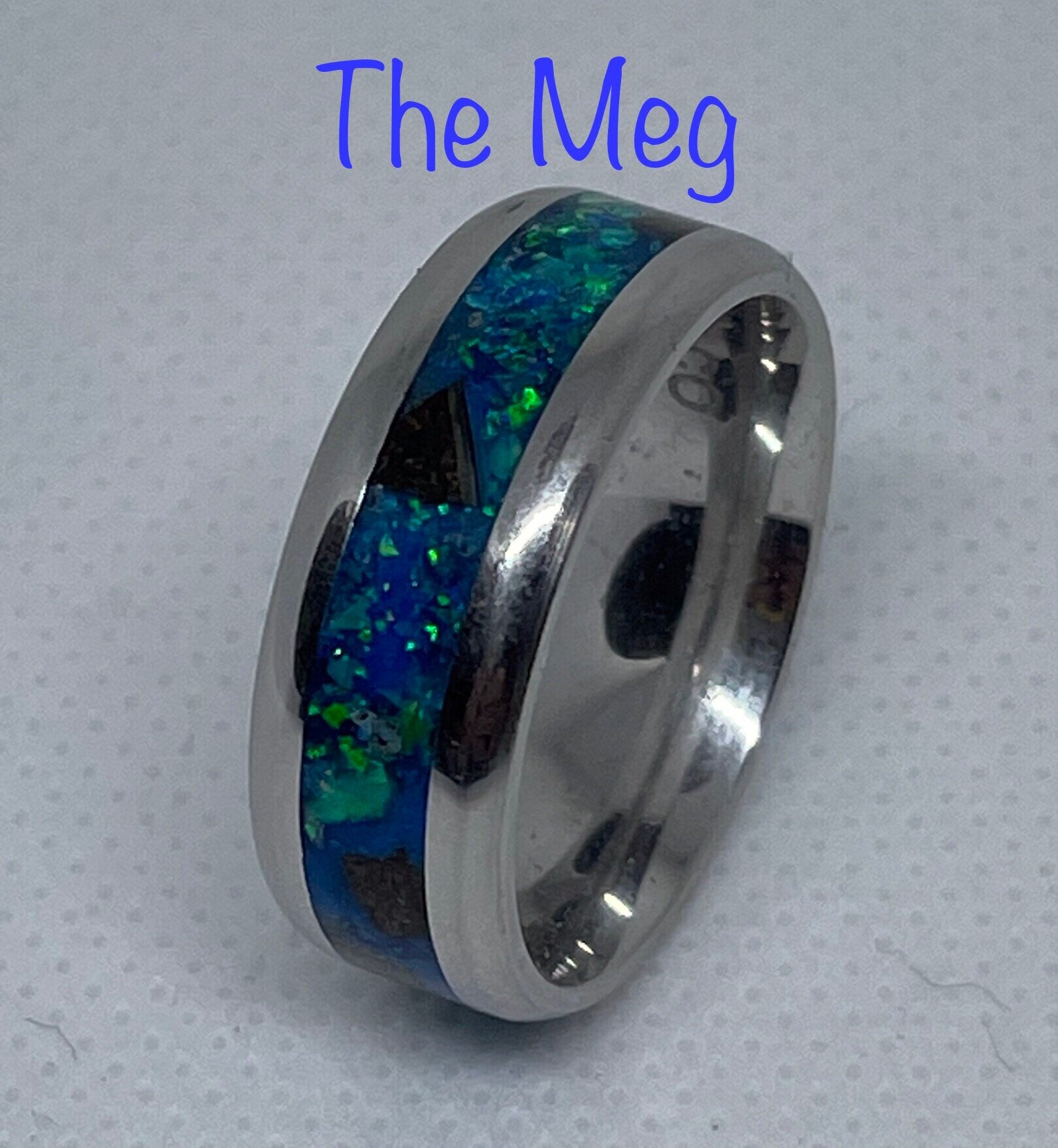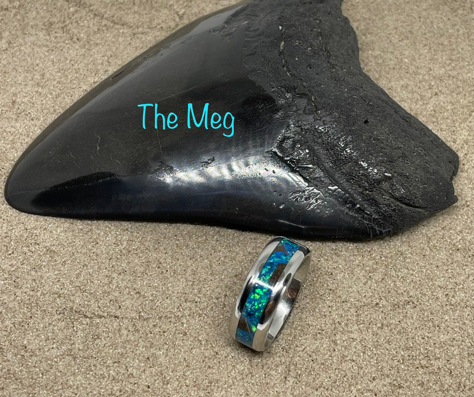 The largest killer of the deep captured in a ring. Megalodon tooth fragments set on a light sapphire base with a special mix of crushed opals creating an oceanic scene in a cobalt chromium band. Charge with uv light for a blue/aqua glow. Must have for any fan of The Meg.