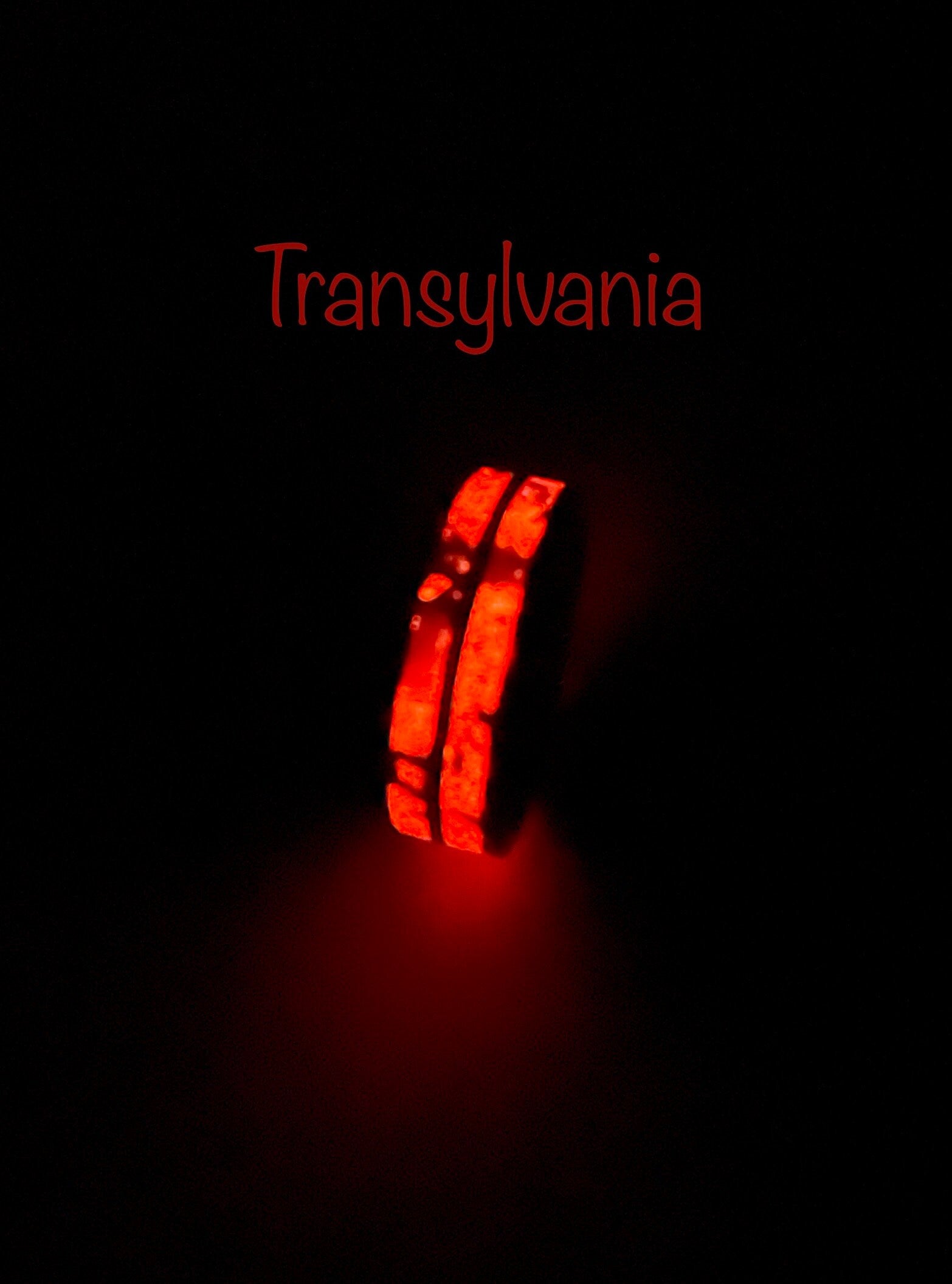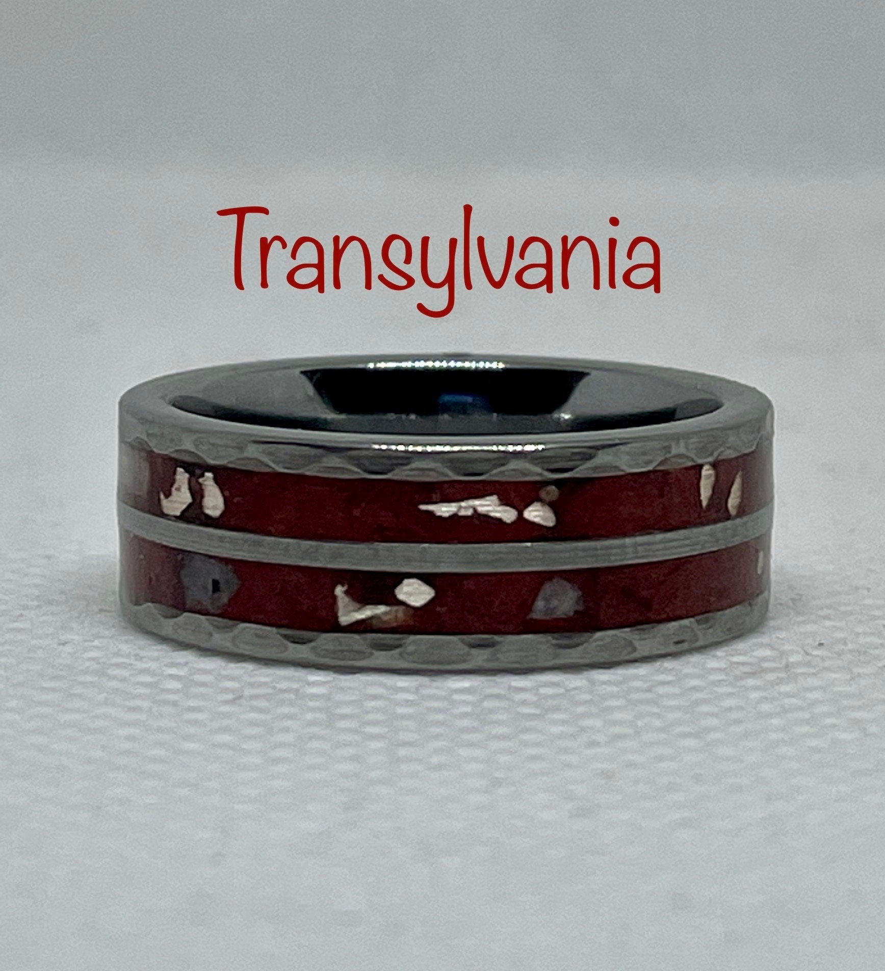 There are many myths and superstitions originating from Transylvania. Vampires, Werewolves, and Strigoi are some of my favorites. Keep these evil creatures at bay with the Transylvania ring. The Transylvania ring is a double channel hammered tungsten band containing crimson pigment mixed with red glow powder, moonstone, and 925 sterling silver fragments.